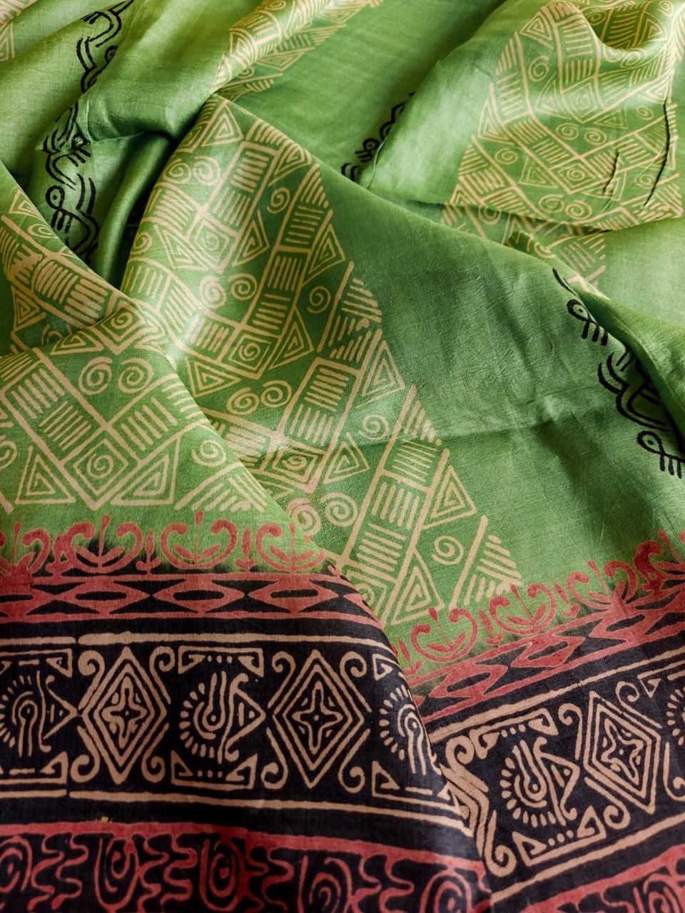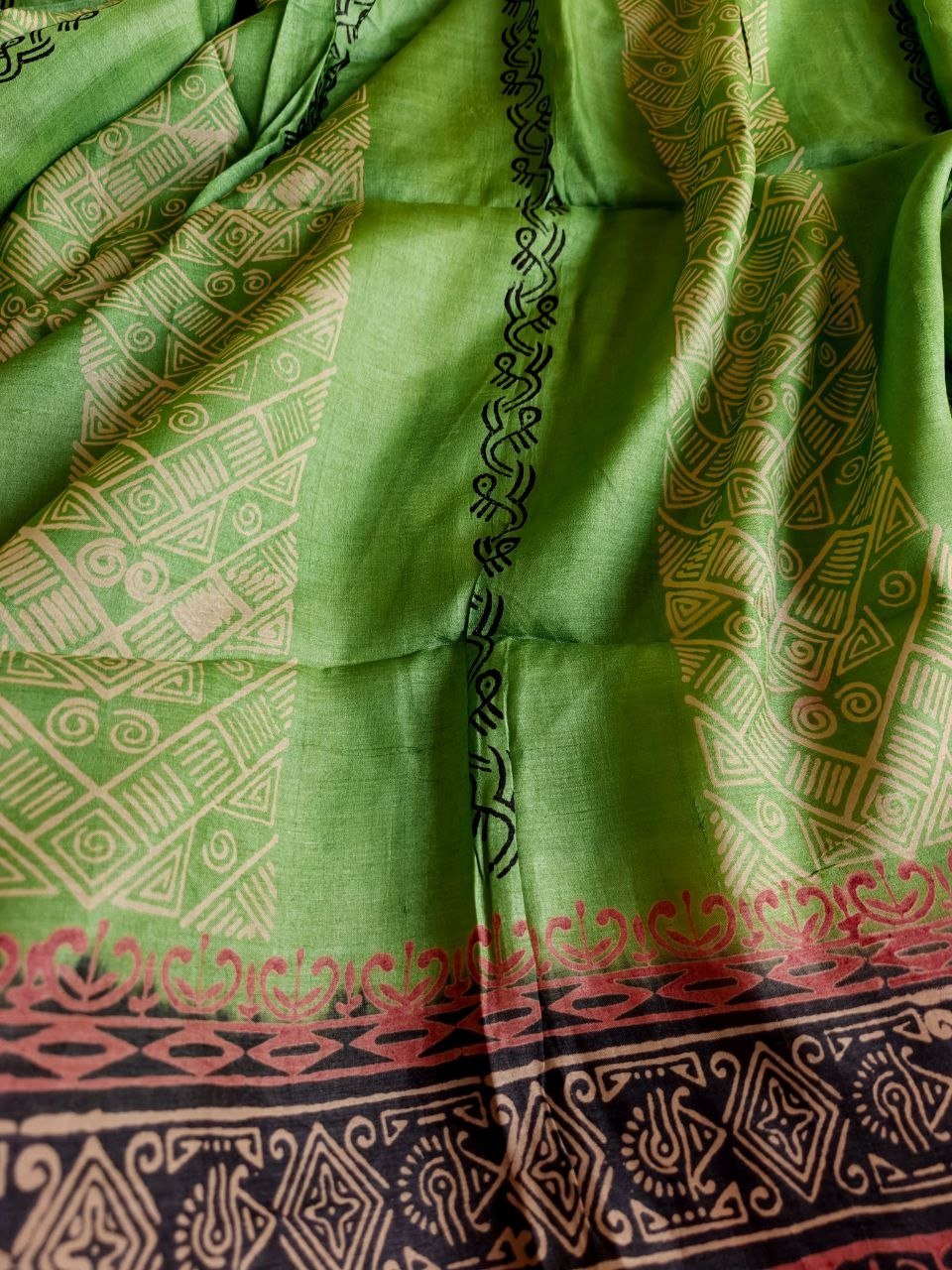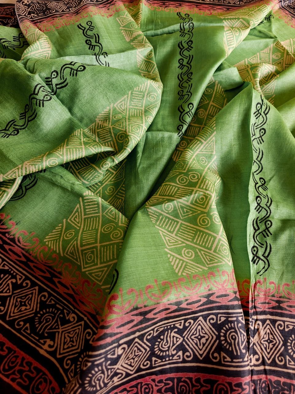 An organic hand block printed pure Tussar Silk saree- almost fluid, draws its vocabulary directly from ancient cave paintings and tribal geometry.