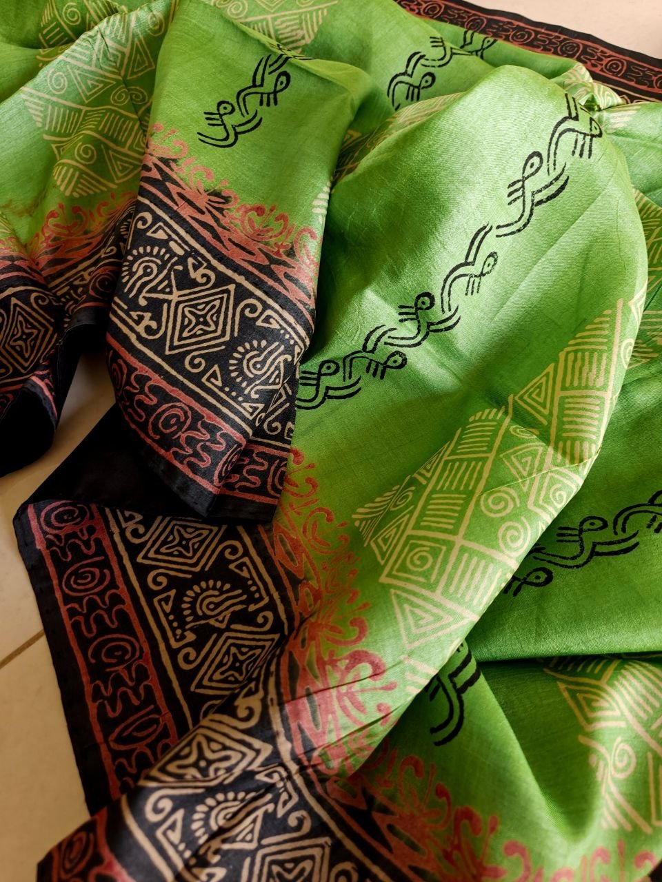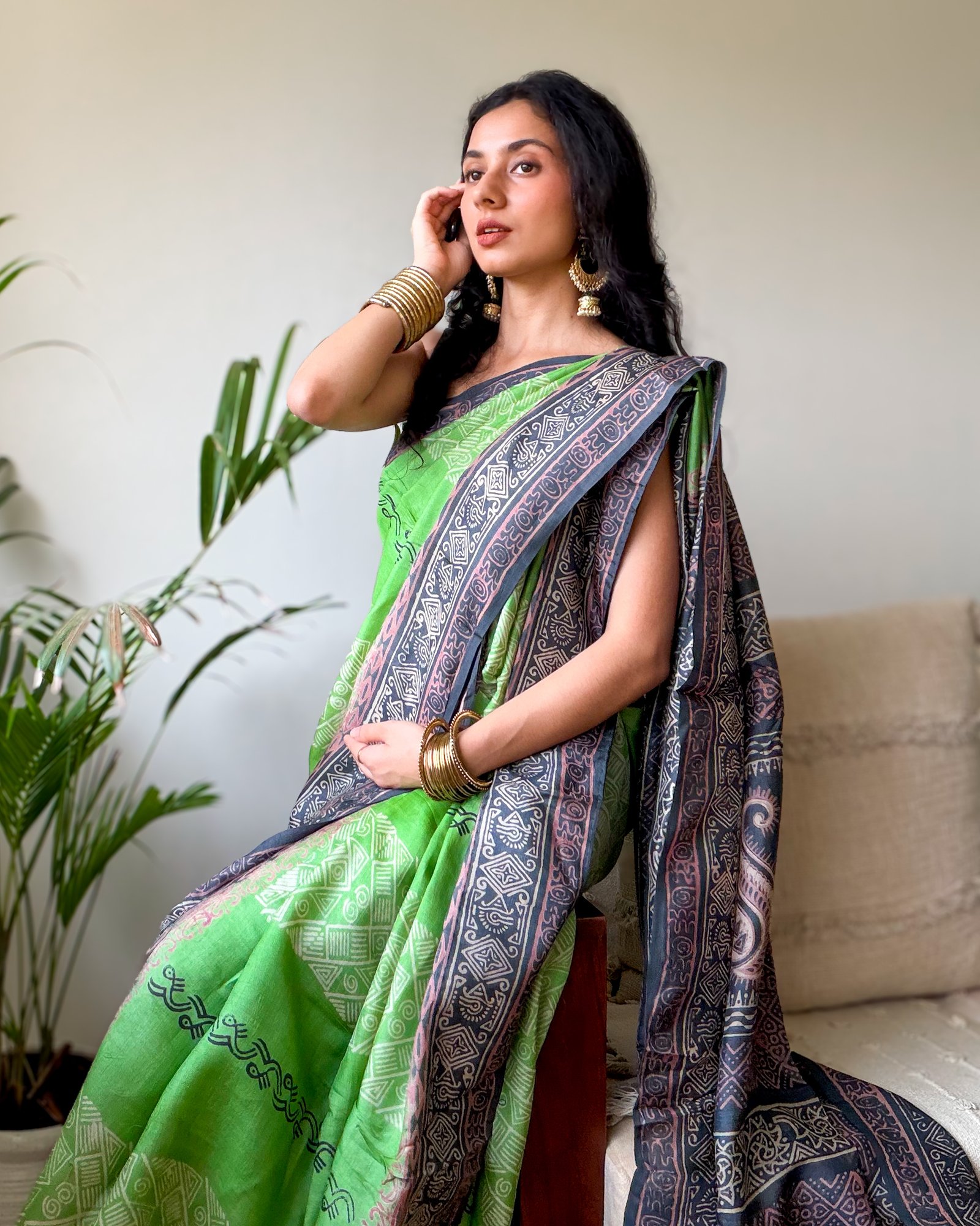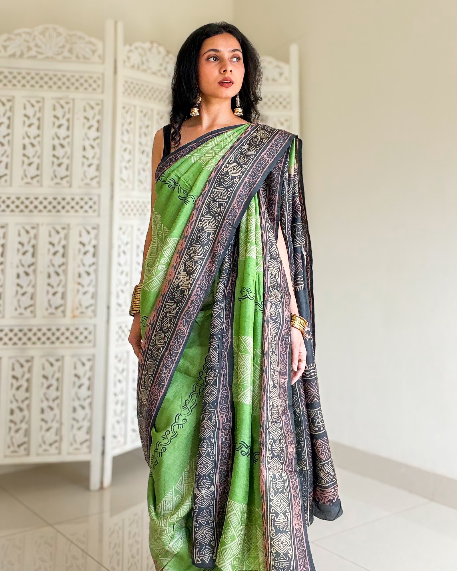 An organic hand block printed pure Tussar Silk saree- almost fluid, draws its vocabulary directly from ancient cave paintings and tribal geometry.