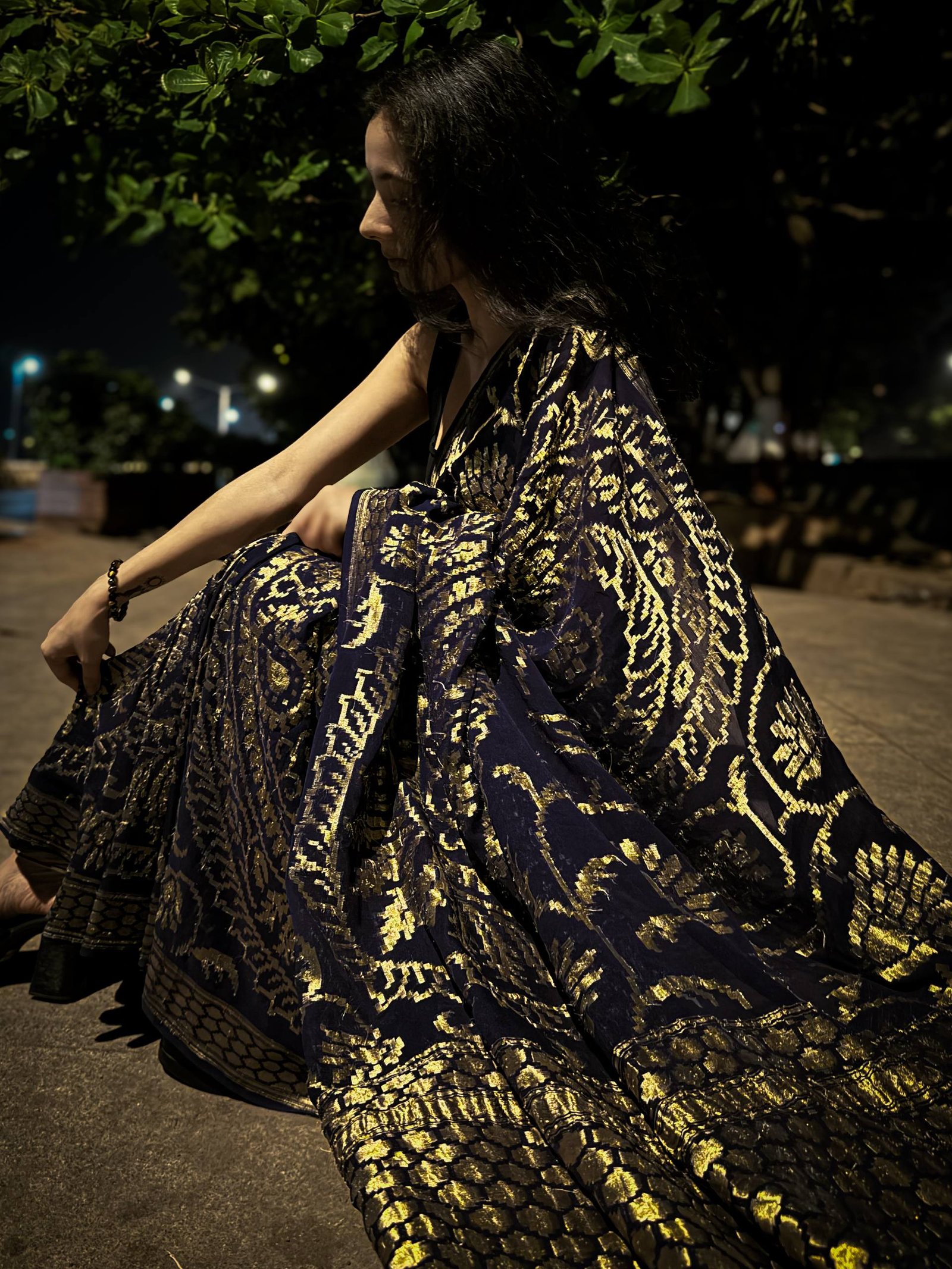 The saree has the fluidity of water and weightlessness of air. It drapes effortlessly, gliding onto your skin, almost like your second skin.