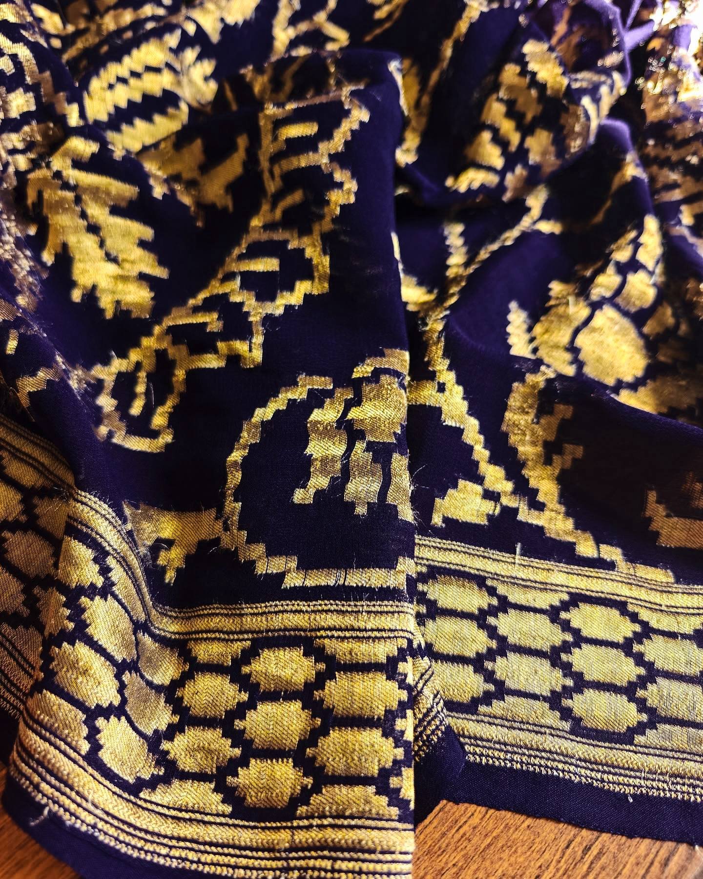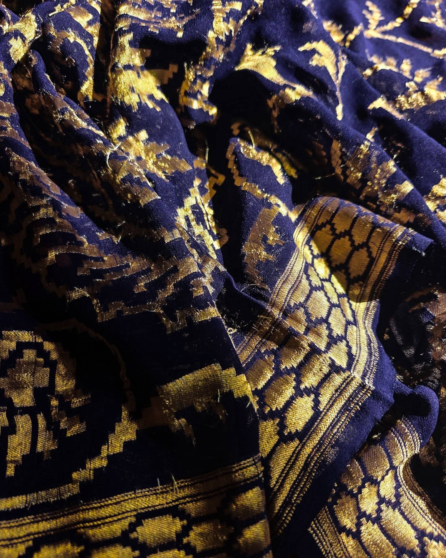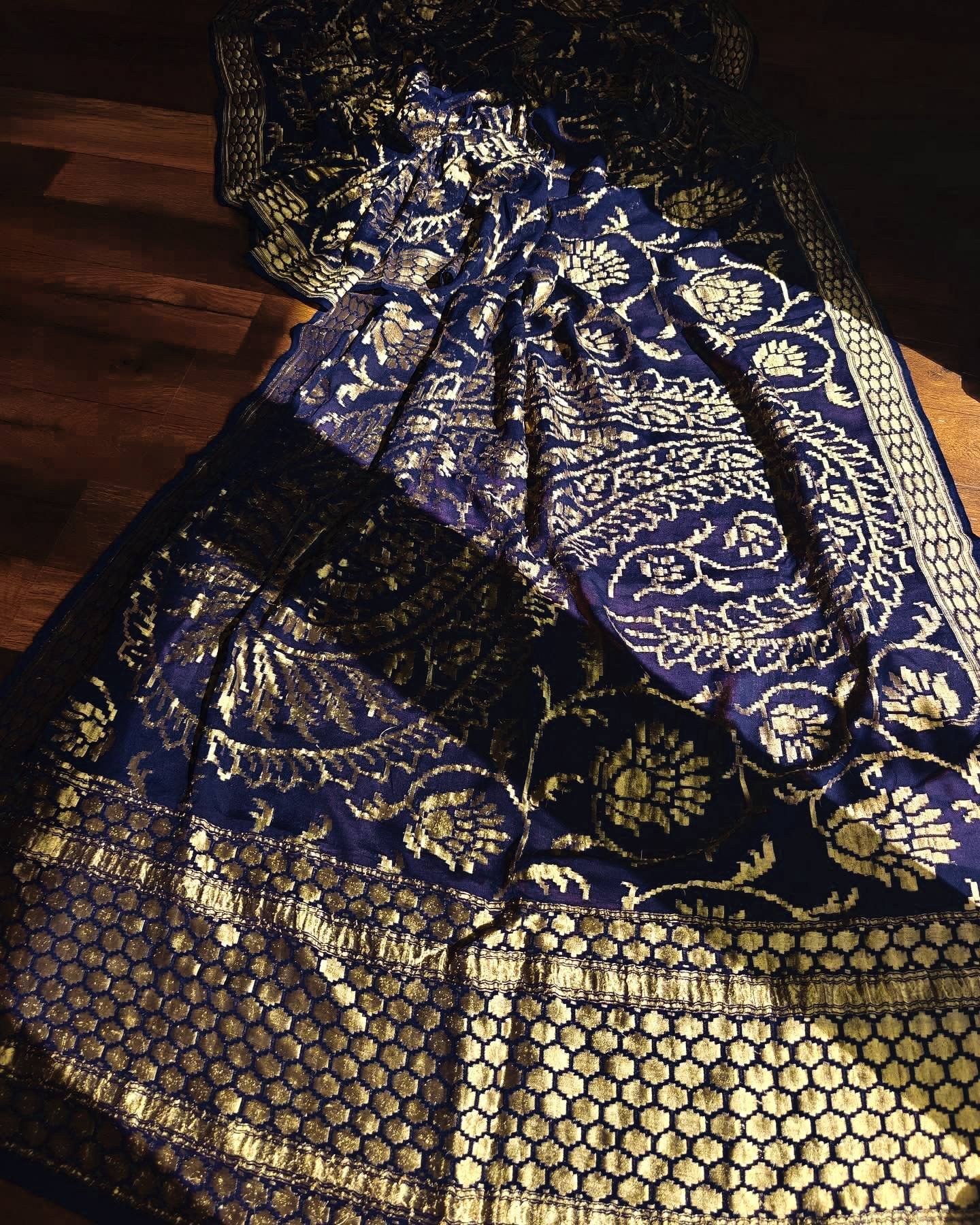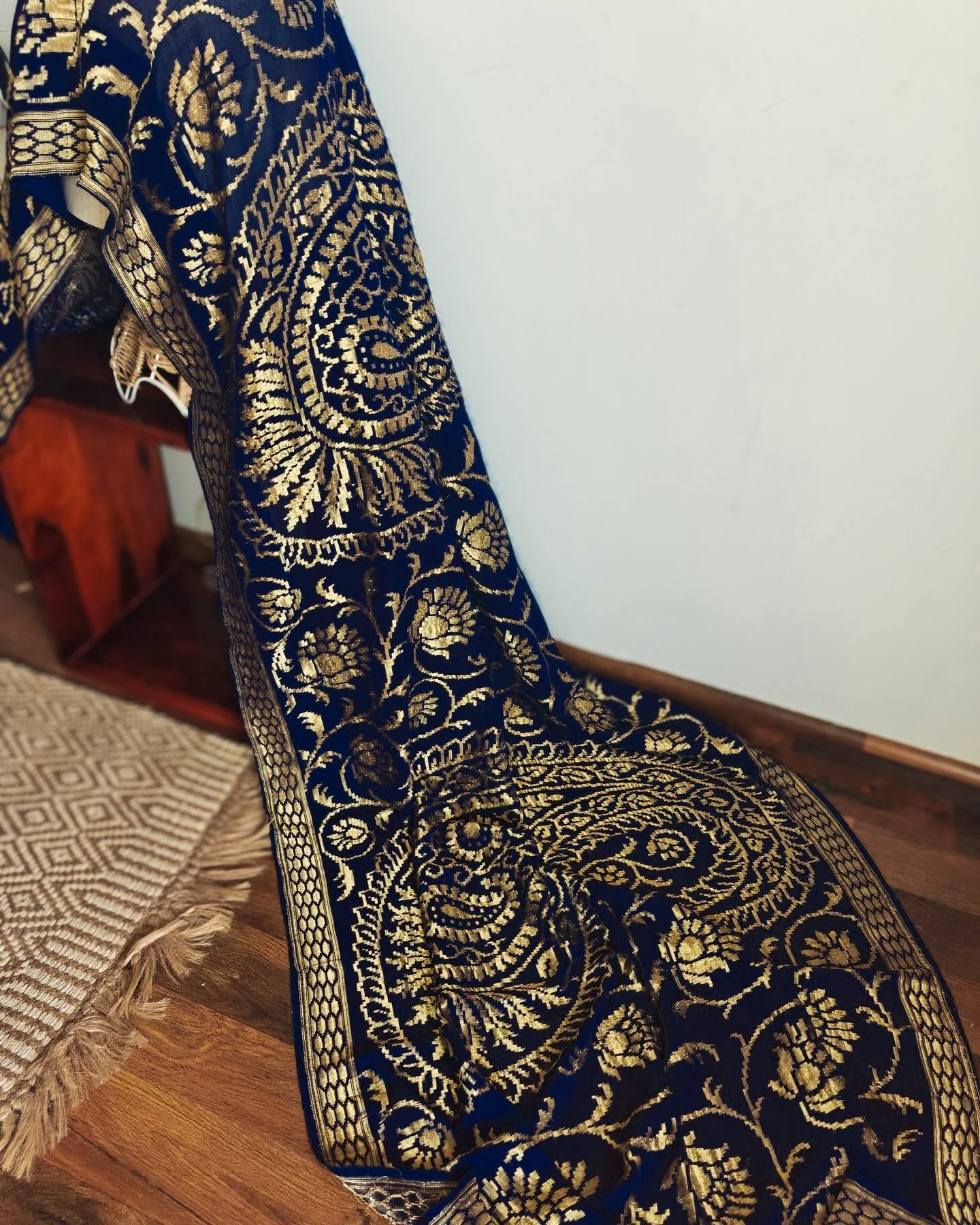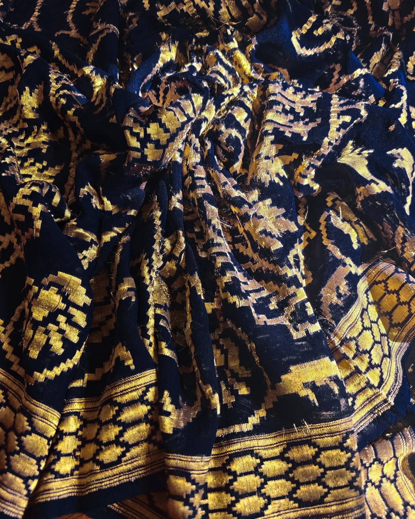On a pure georgette base, thousand of golden zari threads weave an intricate kadhua jaal, each motif is separate from another yet so synchronised.