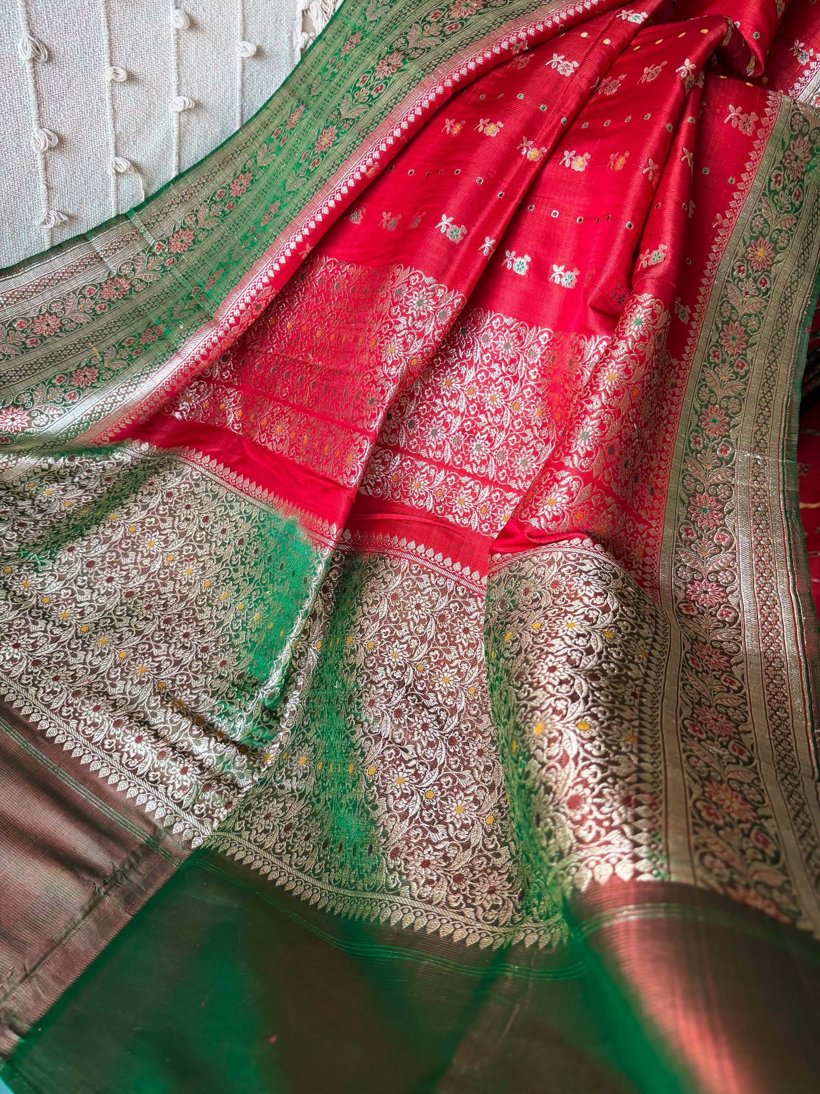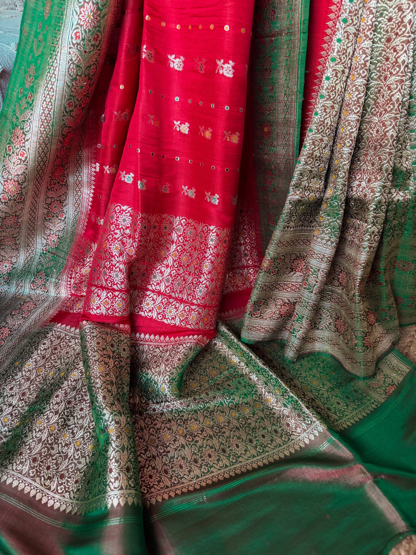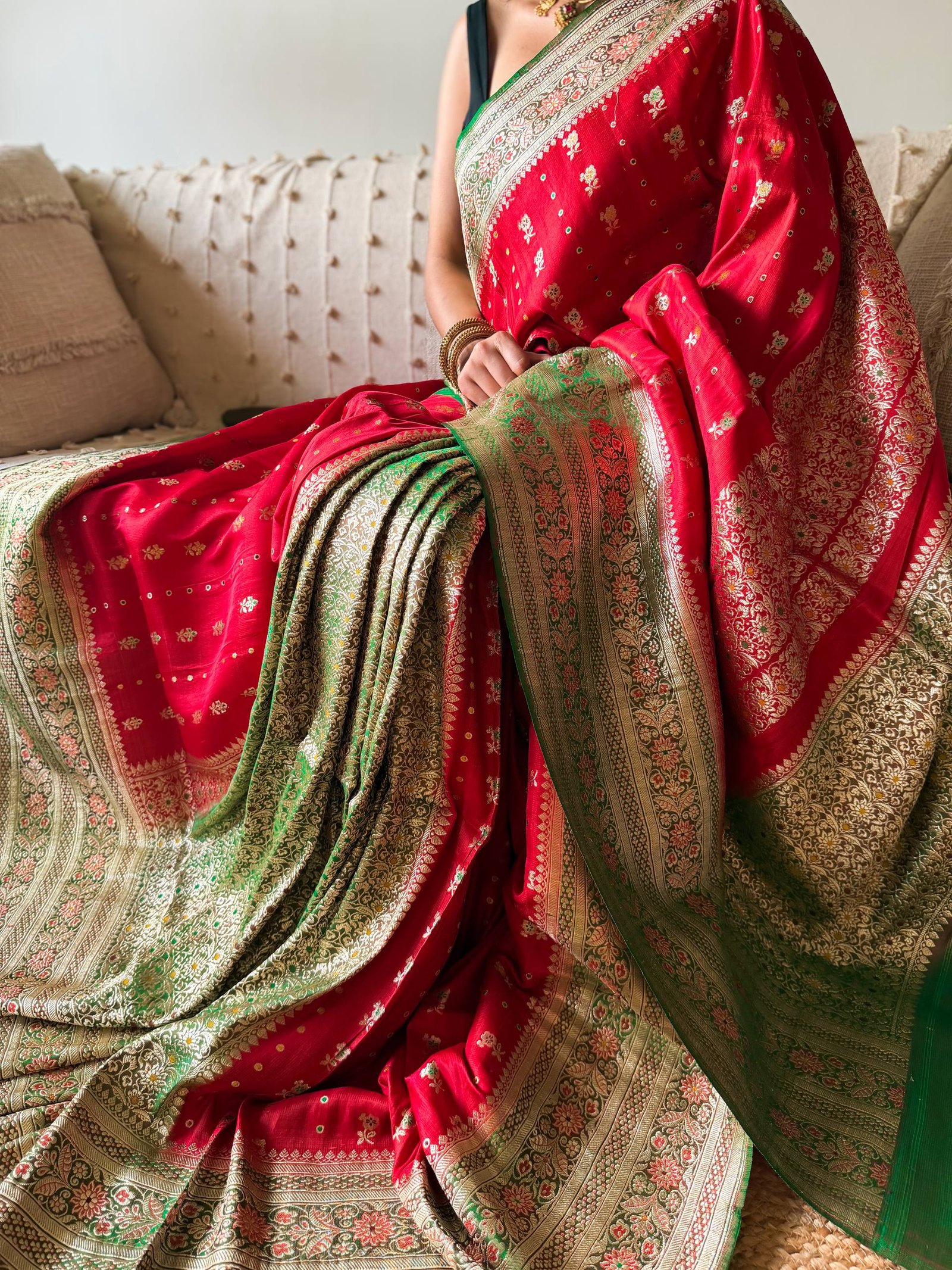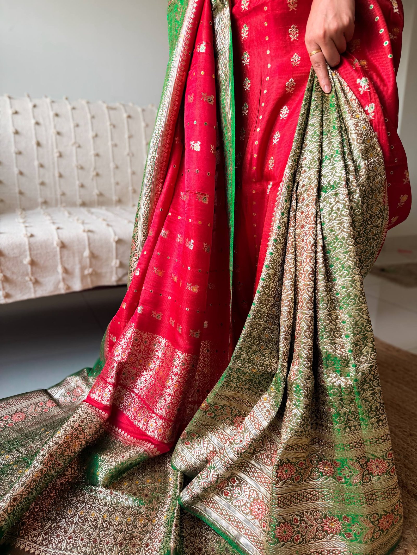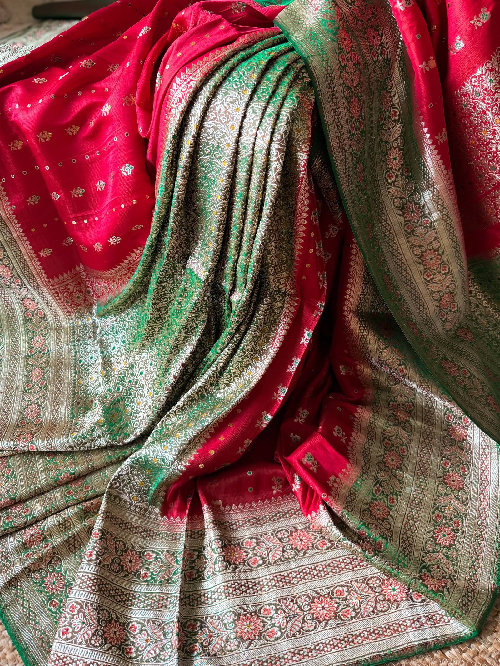 A saree inspired by rose. Rose red body, contoured with contrasting emerald green, making it a heirloom masterpiece.