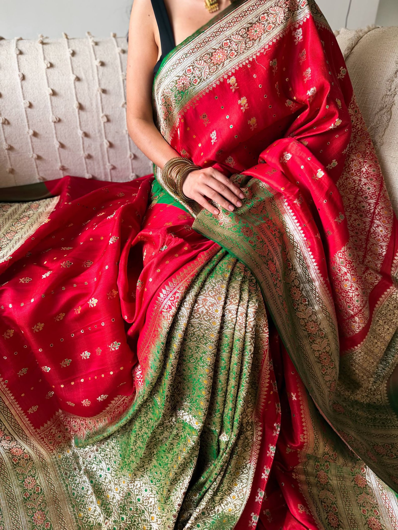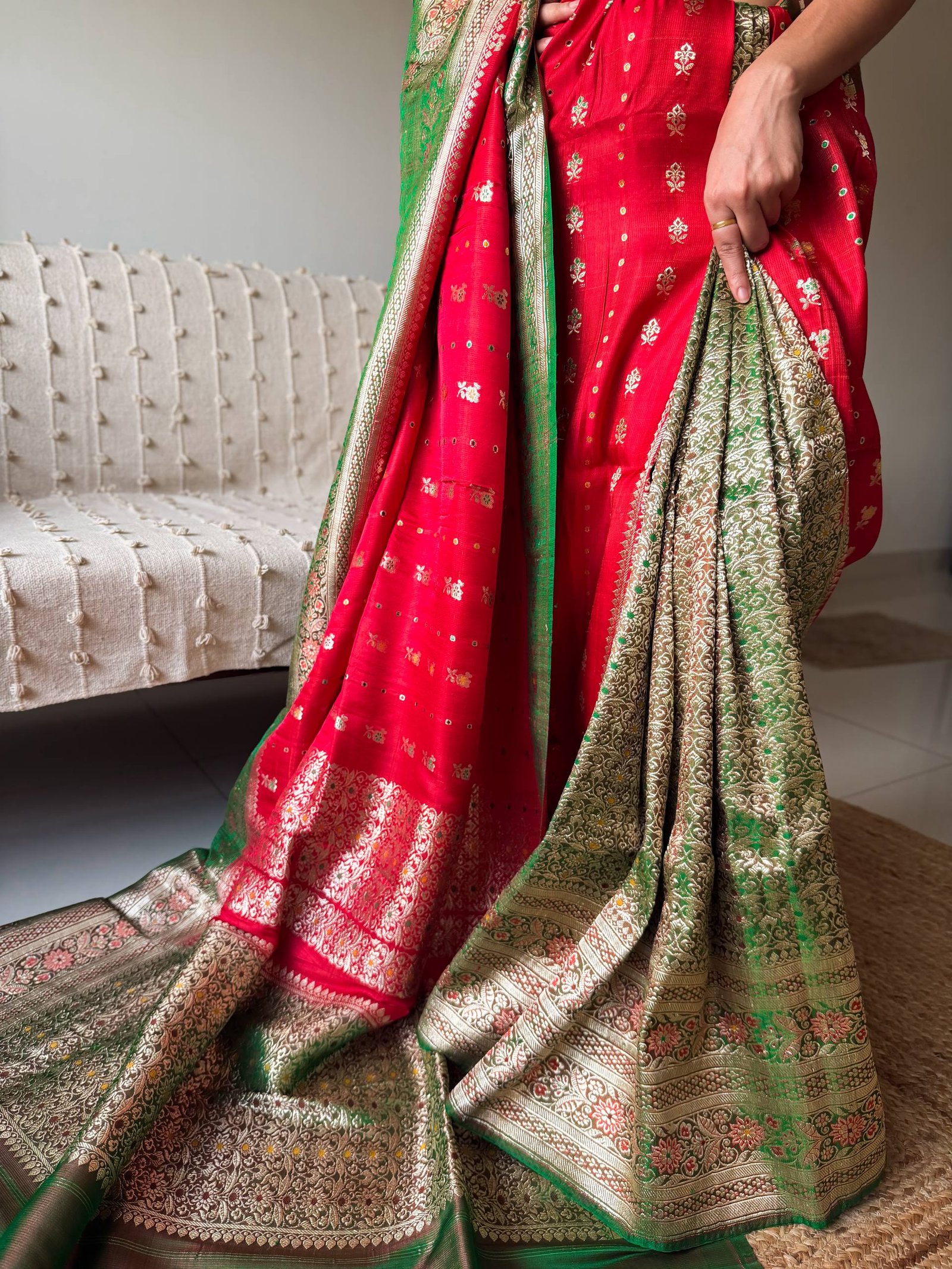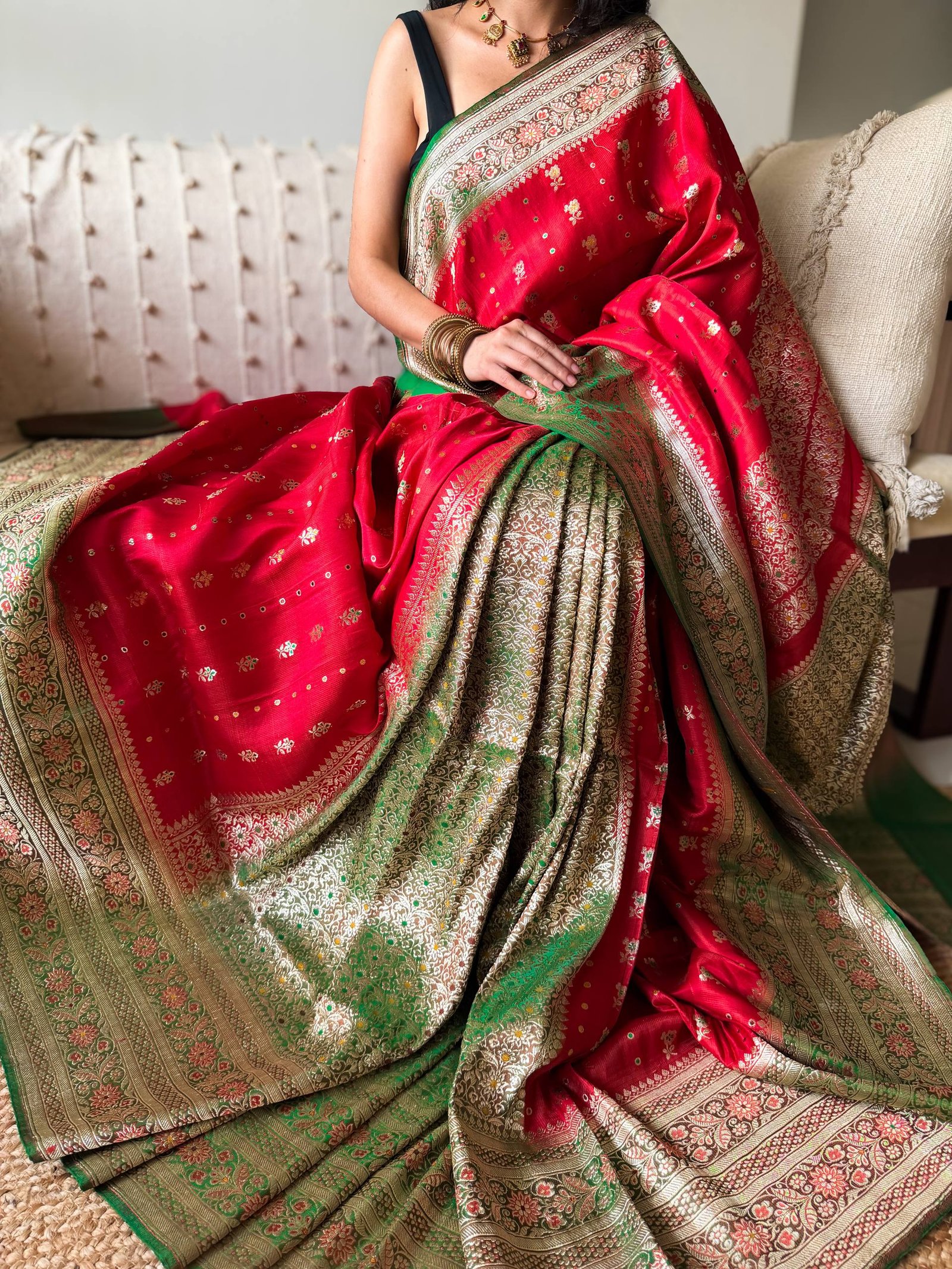 The saree starts with the blushing rose red, emerging into a full zari jaal royal pleats, engraved on emerald green, again opening in the blushing rose red, then the patli pallu.